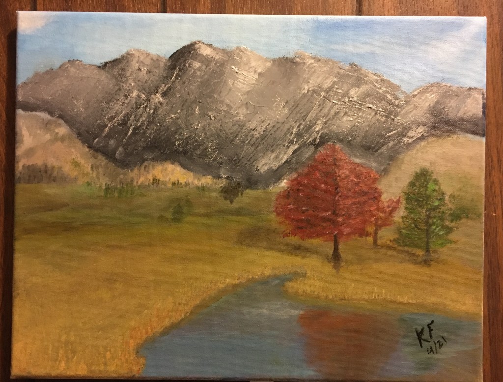 I needed a “blue hue” in the background of the valley in order to show depth. That took quite a few tries. I redid the red tree and concentrated on their reflection in the stream.